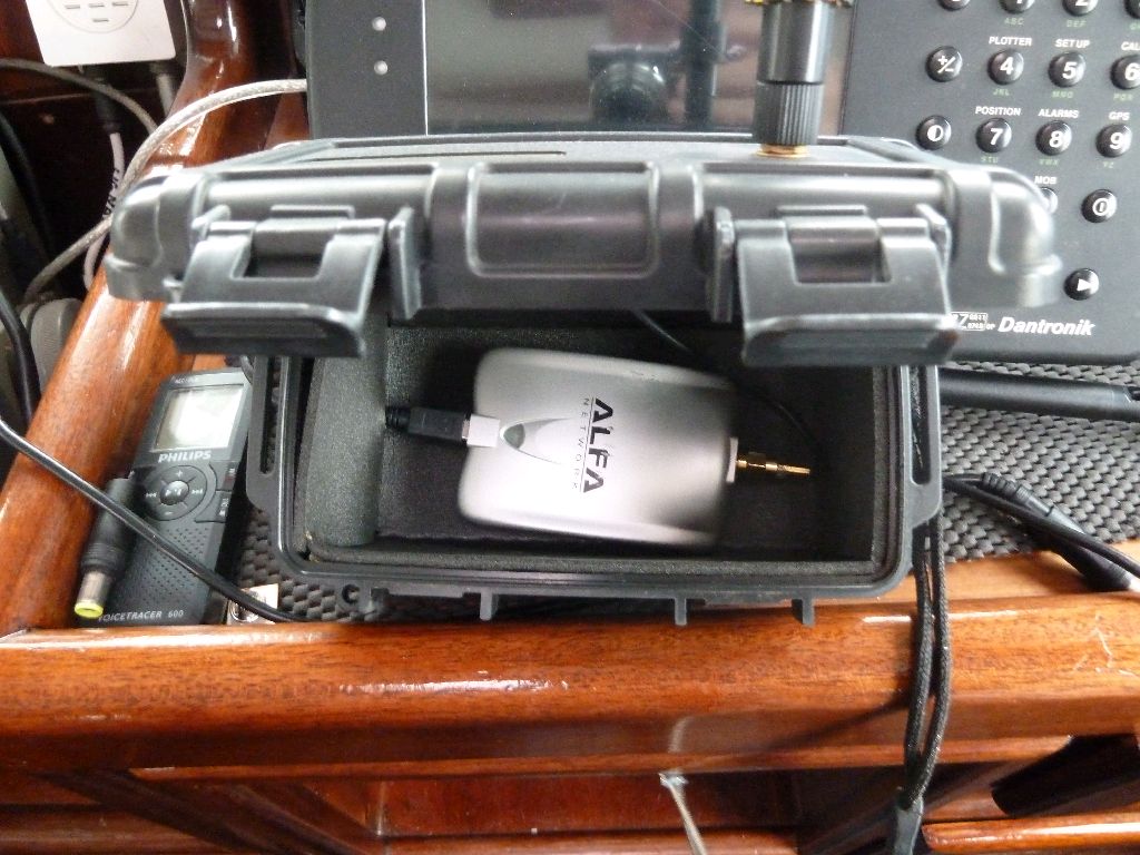 Die Alfa Antenne. Eine hochwirksame W-LAN Antenne, mit der freie Netze eingefangen werden können. Es ist übrigens legal in Deutschland, was in der Luft ist, darf man sich fangen, gibt’s ein Grundsatzurteil. Schon früher haben wir uns in der Ostsee im Vorbeisegeln an Bagenkop den neuen Wetterbericht und unsere Mails abgeholt, sozusagen während der Fahrt. Es gibt viel teuerere Antennen, in einigen steckt – wer hätte das gedacht – eine Alfa. Wir haben sie in eine wasserdichte Box gebaut und stellen sie aufs Ruderhausdach. Hat bestens funktioniert. Was macht ein Segler von heute ohne Internet – nicht auszudenken! Sea u Bert