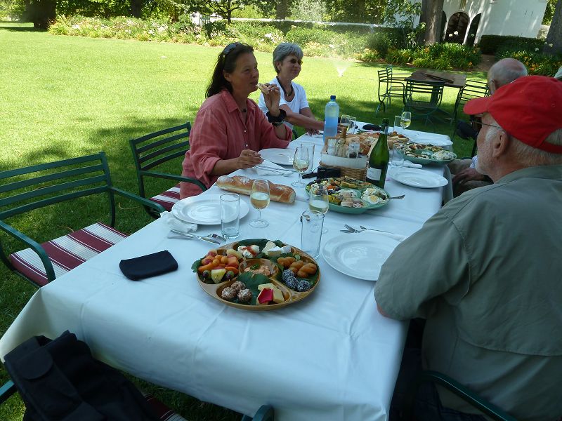 Buitenverwachting. Wir hatten sie zum Picknick eingeladen, vor langer Zeit. Wir hatten gesagt, wenn ihr in Kapstadt seid, dann… Nun sind sie da, die Momos und die Thules. Zu sechst im PKW sind wir zum Weingut Buitenverwachting gefahren, und wir hatten ein wunderbares Picknik und viel Spaß unter einem riesigen alten Baum. Wenn so Segler zusammen sitzen, gibt’s immer viel zu erzählen. Sea u Bert