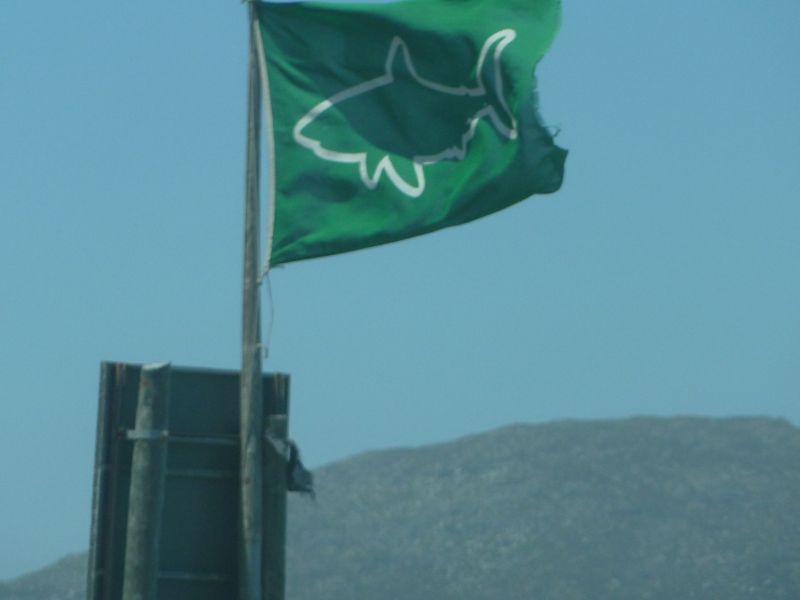 ….ist in Südafrika kein Film. Den gibt’s hier. Eine Flagge wie diese bedeutet, dass der Sharkspotter, der auf dem Berg sitzt, keinen Hai gesehen hat. Sichtet er einen, setzt er die rote Flagge. Junge Surfer sind manchmal schlauer, suchen trotzdem die perfekte Welle und zahlen mit dem Leben oder schwersten Verletzungen. Wie vor einigen Wochen geschehen. Sea u Bert
