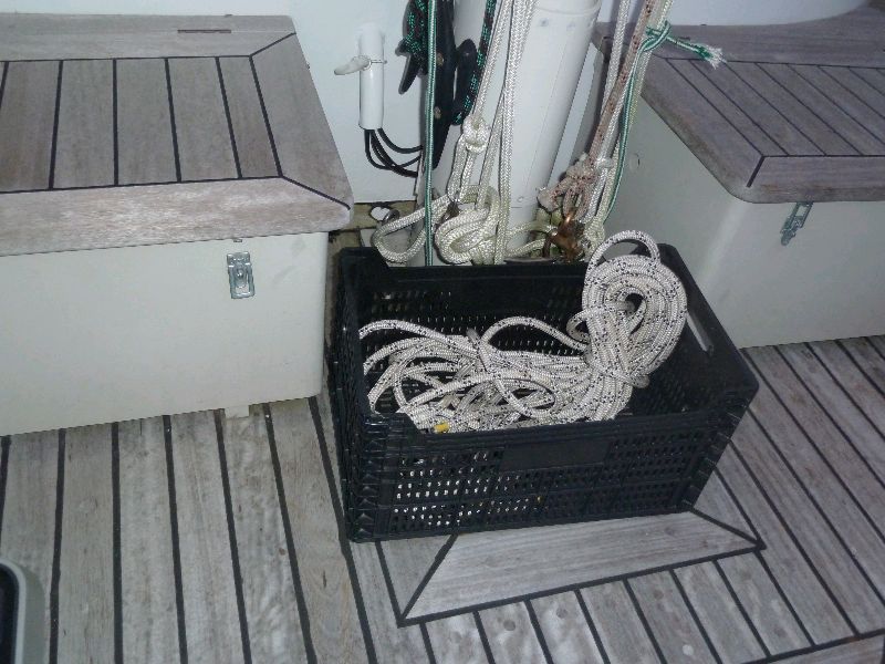 Obstkisten. Diese braunen Obst- und Gemüsekisten hat jede Yacht irgendwo im Schiff, die von Las Palmas aus über den Atlantik gesegelt ist. Die Händler liefern den Proviant darin. Sie sind zäh, robust und vielfach einzusetzten. Die auf dem Bild nimmt schon seit 15000 Meilen die Fallen unter dem Großmast auf, schützt vor dem Über-Bord waschen. Unter Deck ideal für Kartoffeln und im Maschinenraum gut für Ersatzteile. Auch außen an der Reling sind sie gut für die Landschuhe, damit die Kakerlakeneier nicht an Bord kommen. Und die gesammelten Muschelschätze passen auch gut rein. Sea u Bert