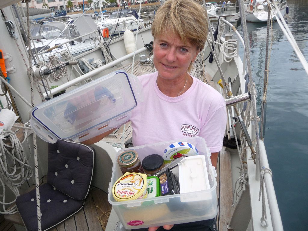 Die Sandwichbox. Eine Klickbox, gab’s im Mediamarkt. Dicht und mit Tragegriff im Deckel. Wir benutzen die für alles, was nicht nass werden darf. In der Sandwichbox ist alles drin, was man braucht, um sich ein Brot zu machen, bis auf das Brot. So grabscht man sich einfach die Box und das Brot und der Tisch ist gedeckt. Geht im Seegang auch auf den Knien. Auch prima für den schnellen Imbiss nachts und der Ausguck ist nicht lange unbesetzt. Sea u Bert