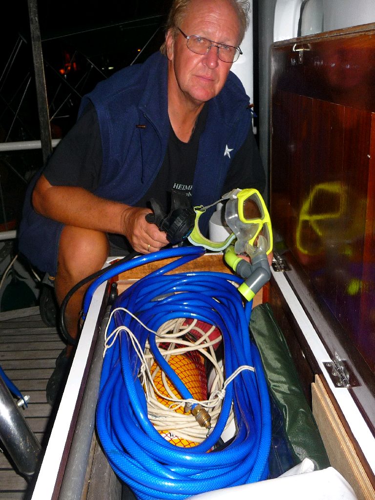 Tauchgerät mit Schlauch. In der Backskiste hinter dem Ruderhaus haben wir eine Tauchflasche, an die ein etwa 15 m langer Schlauch angeschlossen ist. Tatsächlich ist es ein Gartenschlauch aus dem Baumarkt. Besser sind die Schläuche aus dem Tauchshop. Wir haben ihn zwischen die erste und zweite Stufe des Atemreglers montiert. Wenn Heimkehr etwas in der Schraube hat, was da nicht hingehört, bin ich wenn’s sein muss, in einer Minute dort und kann mit Pressluft lange arbeiten. Leni dreht oben auf und fertig. Auch zum Bauchschrubben (Schiffsbauch) hat sich dieses einfache System bestens bewährt. Übrigens, Leni und ich sind beide ausgebildete Taucher. Bei der Arbeit unter dem Schiff sind wir nie tiefer als 2 m. Sea u Bert
