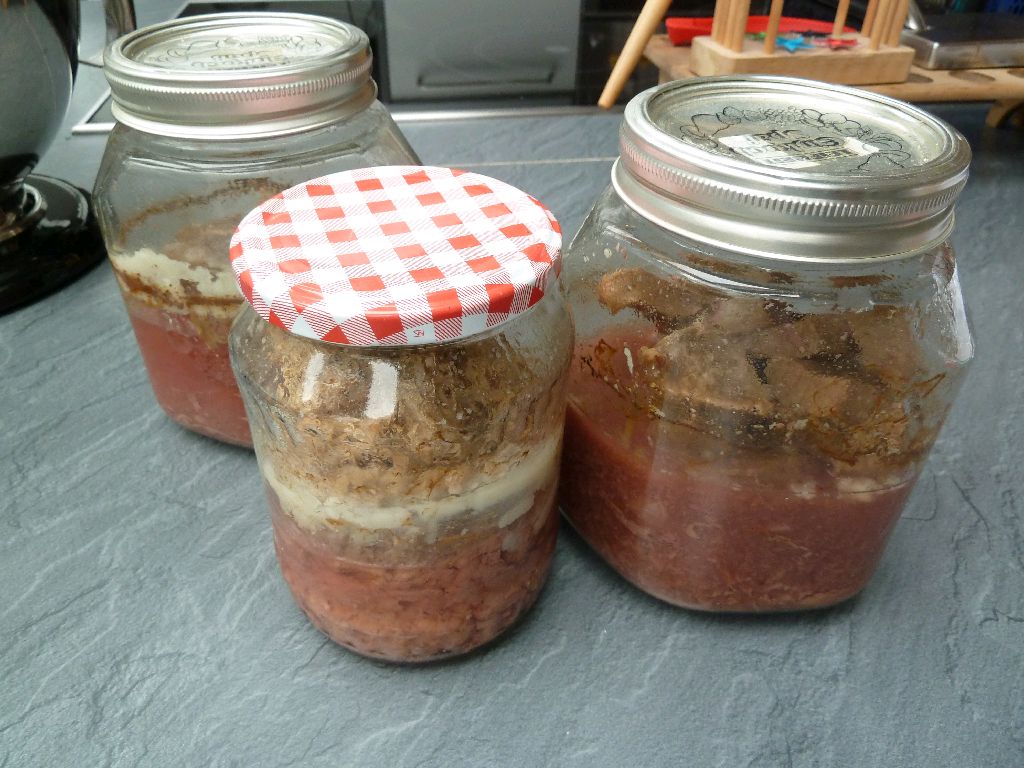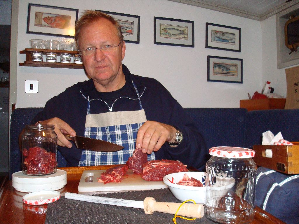 Einkochen. Diese Konservierungsmethode aus der Zeit unserer Eltern und Großeltern ist ein bisschen aus der Mode gekommen. Zu Unrecht finden wir. Denn es ist verglichen mit der Tiefkühlung, die uns an Bord meistens nicht zur Verfügung steht, eine unheimlich energiesparende Methode, Lebensmittel für lange Zeit ohne Kühlung haltbar zu machen. Wie funktioniert’s: 500 g ungewürztes Fleisch in twist-off-Gläser füllen, Deckel lose drauflegen und für 20 Minuten unter Druck im Schnellkochtopf sterilisieren. Den Schnellkochtopf nicht abdampfen, sondern mit dem Öffnen warten, bis er drucklos ist. Dann die Gläser fest verschließen. Das Fleisch, z.B. gekauft auf Helgoland oder in Charleston/USA, ist jetzt fix und fertig zum Verarbeiten für die leckersten Gerichte. Ich habe gerade in der letzten Woche ein Curry aus Fleisch gemacht, das wir vor etwa einem Jahr in Charleston eingemacht haben. Sea U Bert