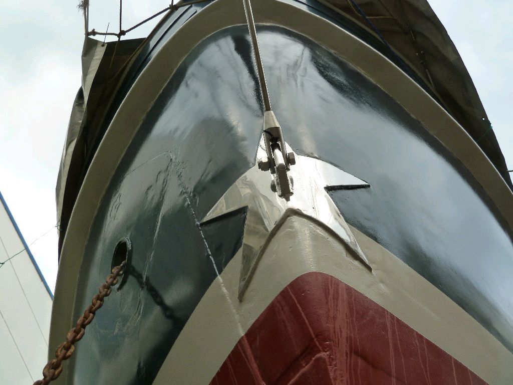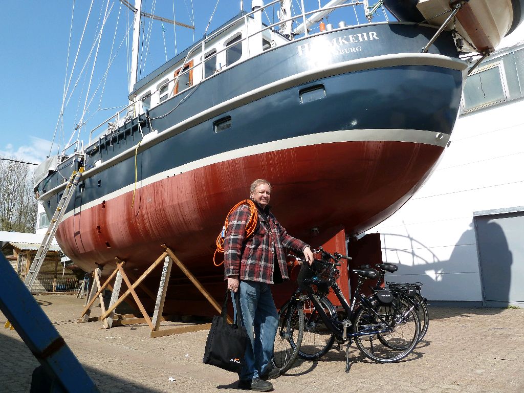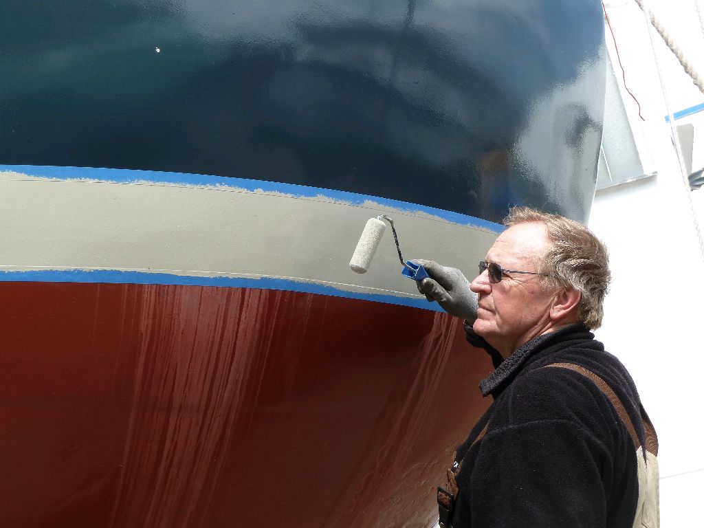 Hier malt der Chef. Glückstadt. Und jetzt noch schnell die Wasserlinie, bevor es anfängt zu regnen. Um den Stau vor der Elb-Fähre zu umgehen, sind wir mit dem Radl da. Ich glaube, so in einer Woche kann die ‘Dicke’ wieder schwimmen. All’s well in der Werft – Marlene Bert April 22, 2012