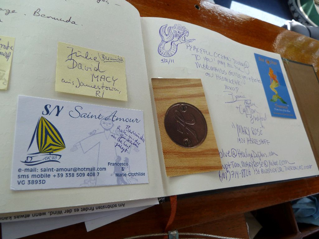 Eine Art Gästebuch. ‘People we met’ haben wir es genannt, ‘Leute, die wir getroffen haben’. Und die stehen da drin. Manche haben Bildchen gemalt, andere ein Rezept oder die Geschichte unserer Begegnung hineingeschrieben. Manchmal kleben auch nur Visitenkarten drin, z.B. vom netten Hafenmeister. Dieses Buch ist eine weitere Idee, die Reise mit ihren vielfältigen Erlebnissen und Begegnungen wachzuhalten. Und dann schreiben wir ihnen ein Mail und hören mal, wie deren Geschichte weitergegangen ist. Unsere hat ein HappyEnd, aber ohne End. Sea u Bert