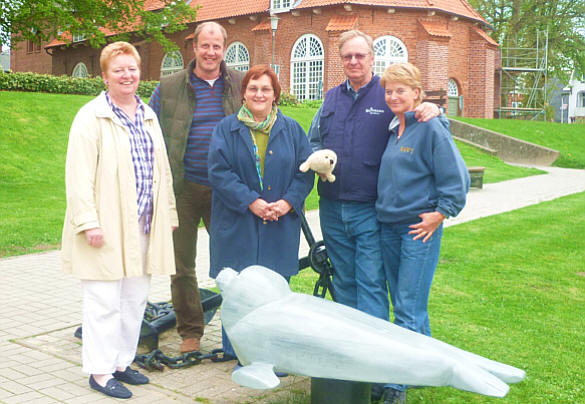 Zur Namensfindung hatten als Ideengeber und Sponsoren die Oberndorfer Transatlantiksegler Marlene und Bert Frisch die Kinder der Kiebitzschule aufgerufen. Zur Jury gehörten außerdem (v. l. n. r.) Renate Bölsche vom Vorstand der AG Osteland, Tourismusvereinschef und Ostepreisträger Niels Uhtenwoldt sowie Kiebitzschulleiterin Christiane Möller. Der ausgewählte Name soll den Kiebitzschülerinnen und -schülern am Montag unmittelbar an der Statue bekannt gegeben werden. Dem Ideengeber bzw. der Ideengeberin winkt als Preis ein Plüschseehund, der Schule ein Spendenscheck.