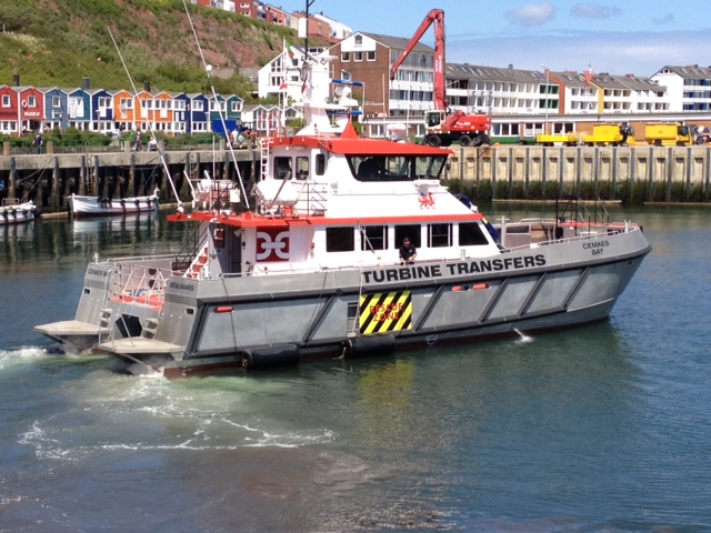 Helgoland. Heute ist das erste Windparkversorgungsschiff aus England eingelaufen. Diese schlechtwetterfaehigen Katamarane können Spitze 23 Knoten laufen und dabei 20 Passagiere, zum Beispiel Techniker, zu den Windkraftwerken bringen. Dort fahren sie dann mit dem Bug gegen ein Bein der Windraeder und setzen die Leute über. Dabei verbrauchen diese Boote etwa 400 Liter Diesel pro Stunde. Nach Angaben der Besatzung sollen binnen drei Jahren 17 Fahrzeuge dieser Art von Helgoland aus eingesetzt werden. Der nächste Windpark befindet sich 23 Meilen nördlich der Insel. Sea u Bert