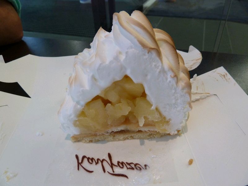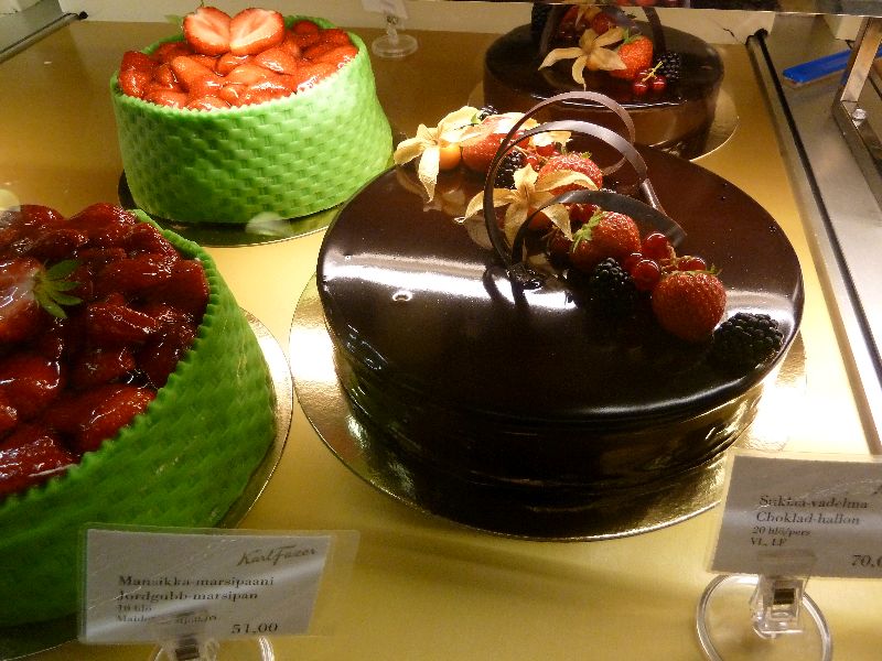 Helsinki. Hier sitzt die Firma Fazer. Bestens bekannt durch Fazer Mint, Marianne Bonbons, Dumle und andere Kalorienträger. Das Mutterhaus ist eine Konditorei, mit Schlange vom Tresen bis auf die Straße. Die Torten sehen aus wie lackiert. Die schokoladige Torte auf dem Bild kostet 70 Euro. Wir haben uns allerdings mit diesem Apfelbaiserstück (6 Euro) begnügt und den Kaffee im McCafe getrunken. Obernorfer Butterkuchen wie von Buck aus Cadenberge hatten sie hier nicht. Sea U Bert
