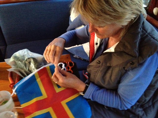 Sottunga. War nicht einfach den Mädels im Kiosk die Flagge (Fähnchen) ab zu schnacken. Anyway wir haben es geschafft. Leni hat eine Leine eingenäht und nun können wir uns wieder sehen lassen. Wir werden sie als alleinige Gastlandsflagge, also ohne die finnische fahren, nachdem wir gesehen haben, dass die staatlichen Fähren die Alandsflagge als Nationale und die finnische als Gastlandsflagge fahren. So haben wir es auch auf den Shetlands und den Orkneys gemacht. Sea U Bert