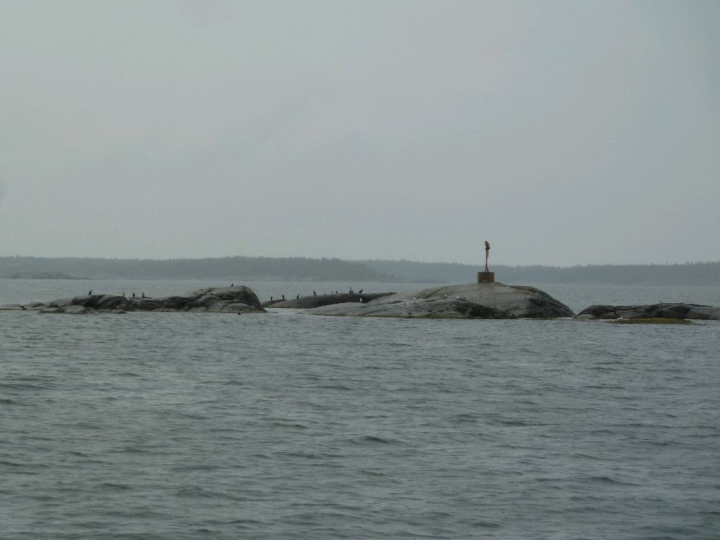 In den Schärengewässern zwischen Nynäshamn und Nyköping. Nach einem sonnigen Morgen hat es sich zugezogen und tüchtig geregnet. Weil wir natürlich mal wieder genau da hinmüssen, wo der Wind mit 10 Knoten herkommt, motoren wir gegenan. Bei dem Regen sind wir allerdings auch froh, nicht an Deck mit den Segeln rumtüddeln zu müssen. So sitzen wir lieber gemütlich im Ruderhaus und trinken Tee. Einige Schiffe machen ganz schön viel Schwell. Achtung: Teetassen festhalten! Der Alte betakelt eine Festmacherleine und tüftelt den Zickzack-Kurs durch die Felsen aus. Bei der flachsten Stelle hatten wir gerade mal 80 cm unterm Kiel. Wir haben uns an flache, enge Fahrwasser gewöhnt. All’s well on board. Marlene
