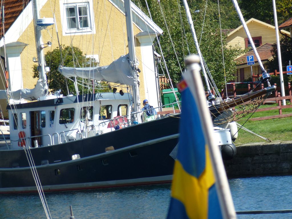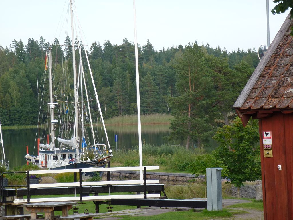 Im Göta Kanal. Wir müssen heute (Mittwoch) früh aufstehen, weil wir gestern früher Feierabend gemacht haben. Das ist die Strafe! Also um 06.50 Uhr los, damit wir rechtzeitig zur ersten Schleusung in Borenshult sind. Wieder ein sogenannter Flight, fünf Schleusen hintereinander mit einer Hubhöhe von insgesamt 15,3 m. Julia betätigt sich heute als Papparazzi und fotografiert Heimkehr, die Schleusenwärter, uns und die mit uns schleusenden Boote. Da wir heute nur zu zweit schleusen, ist genug Platz und sie muss uns nicht mit dem Bootshaken verteidigen. In Motala machen wir 3 Stunden Pause, da erst um 18.00 Uhr die Brücke in Karlsborg öffnet. Spaziergang durch die Stadt, anschließend überqueren wir den zweitgrößten See Schwedens, den Vättern See (17,5 Seemeilen). Er ist mit 128 m auch einer der tiefsten. Mittendrin stoppen wir und schwimmen eine Runde im 17 Grad kalten/warmen (Ansichtssache) Wasser. Wir machen vor der Schleuse in Forsvik fest und sehen uns das leider schon geschlossene Industriemuseum von außen an. Heute haben wir 6 Schleusen, 7 Brücken und einen See passiert, insgesamt 31 Seemeilen zurückgelegt und befinden uns 88,5 m über der Ostsee. Das schöne Wetter lockt zum Grillen und der Skipper verwöhnt die Crew mit frischen großen Krabben (Räkor) und Steak, sicher mit dem Hintergedanken, dass morgen alle wieder kräftig zupacken können. All’s fröhlich on board – Marlene