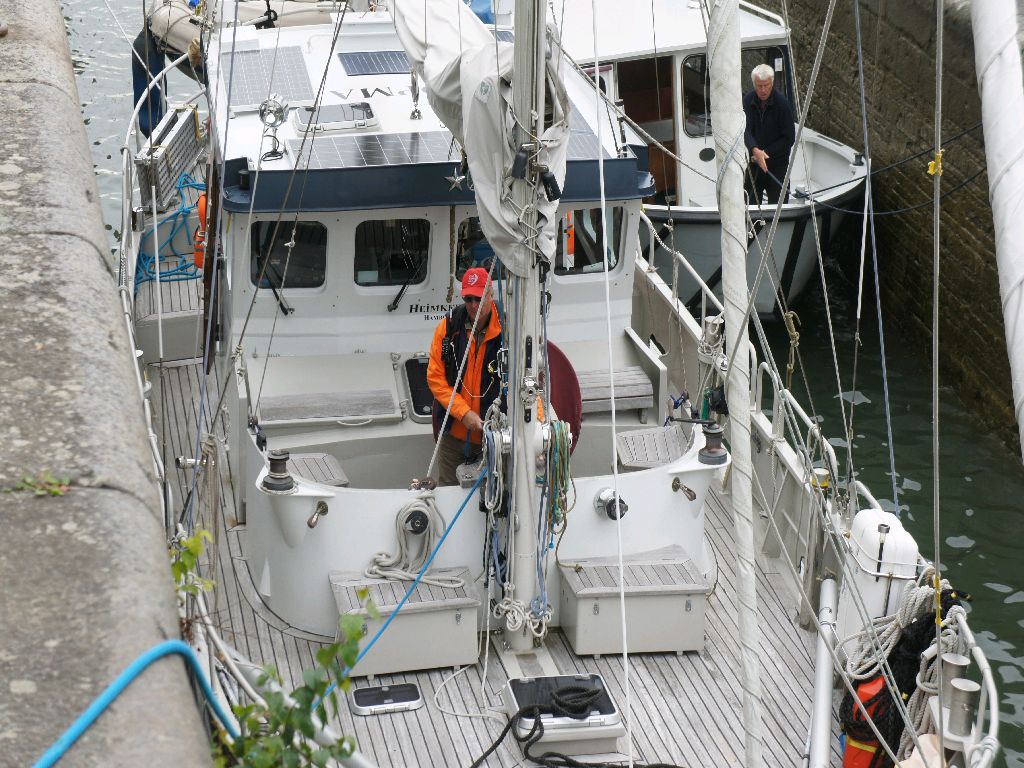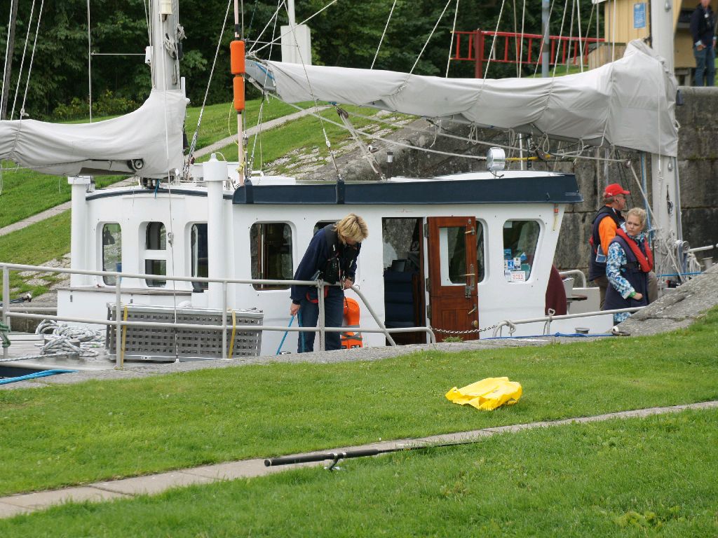 Mariestad, Schweden. Nee, so kann man das nicht sagen. Der Göta Kanal ist ein wunderschöner Weg durch Schweden, das sowieso unser Lieblingsland ist. Allerdings ist er auch ein anstrengender Weg. Glücklicherweise bestätigten uns das auch zwei nette Segler, die nur halb so alt waren wie wir. Heimkehr ist schon ganz schön dick für diesen Kanal, besonders, wenn wir die 58 Schleusen und 45 Brücken gern ohne Schramme passieren wollten. Zwei haben wir dennoch. Der Tiefenalarm des Echolots piepte fast ununterbrochen. Dies führte dazu, das die 2,25 m tiefe Heimkehr sich oft festsaugte und dem Rudergänger einen abwechslungsreichen Job bescherte. Bei einem Schiff von Heimkehrs Kaliber scheint mir mindestens ein zusätzlicher Helfer auf den Schleusen dringend angeraten. Zwei sind besser. Da haben Marco und Julia einen guten Job gemacht. Da ab 25. August Nachsaison ist, durften wir nur im Konvoi fahren. Liegenbleiben, weil’s so schön ist, ging nur mit 4 bis 5 Tagen Wartezeit bis zum nächsten Konvoi. Das ist natürlich zu lang. So sind wir nun in 5 Tagen von der Ostsee in den Vänern geschippert und haben uns gefreut über den Ruhetag hier in Mariestad. Wie Eingangs schon berichtet, nennen die Schweden den Kanal ja ‘Divorce ditch’ – Scheidungsgraben. Leni und ich sind immer noch verheiratet. Die Fotos sind von unseren Freunden Anita und Hagen aus Schweden. Sea u Bert