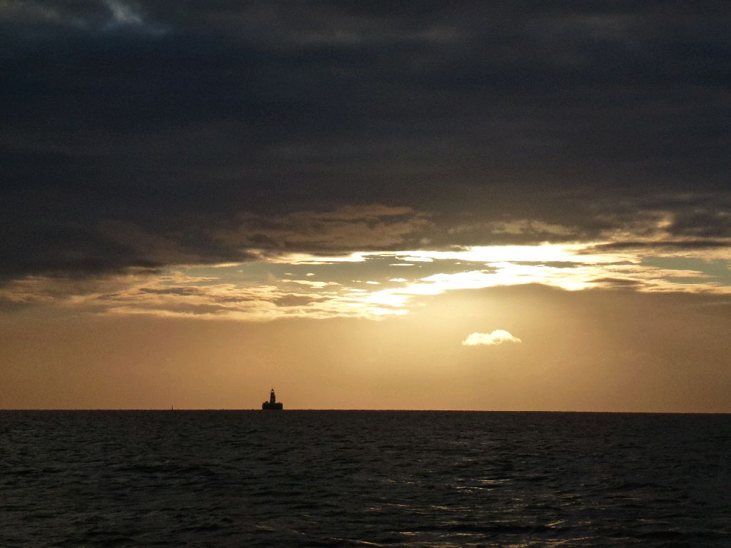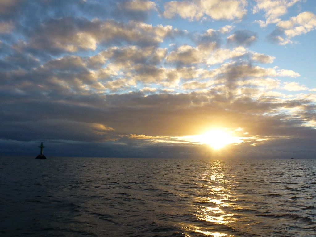 In See. Ein schöner Morgen. Schöne Bilder um den Sonnenaufgang. Und riecht so gut. Aber kalt. Wir müssen so früh los, weil wir heute den Sprung von 70 Meilen nach Ebeltoft schaffen wollen. Nicht weil wir Ehrgeiz entwickeln, sondern weil in der Nacht zum Dienstag ein heftiger Sturm aus Süd bis Südost kommen soll. In Ebeltoft liegen wir geschützt und können leichter in den Kleinen Belt segeln. Sea U Bert