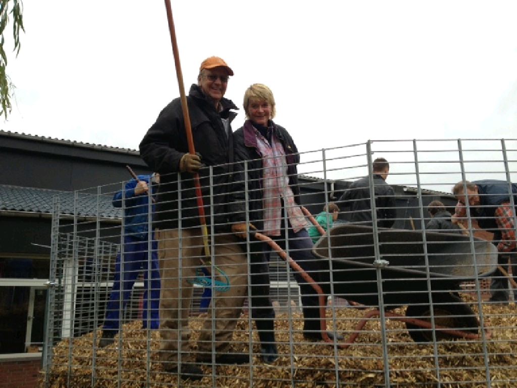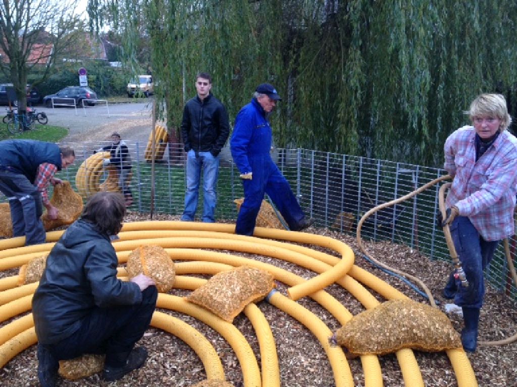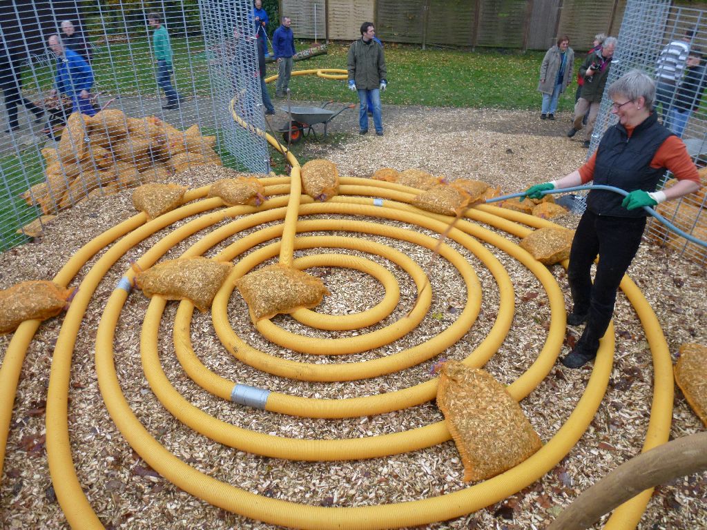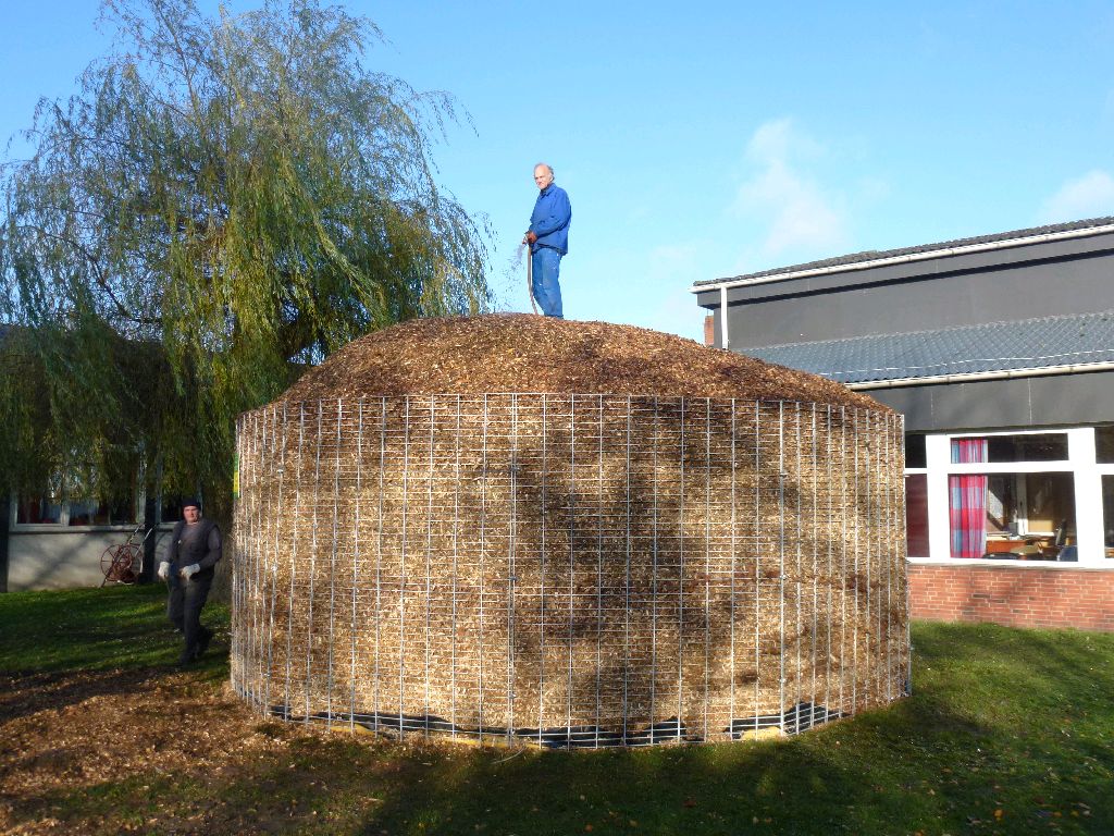 Oberndorf. Unsere hochkreative Kiebitzschule hat sich wieder was ausgedacht: Ein Biomeiler, einst von einem französischen Förster erfunden, soll einen Teil der Schule beheizen. Es handelt sich um einen großen Haufen Baumschredder (140 m3, entsprechend 50 Tonnen), in dem sich Schläuche für Luft oder Wasser befinden. Durch den bakteriologischen Prozess im Meiler entsteht eine Temperatur von bis zu 65 Grad, die sich über eineinhalb Jahre hält. Die durch den Luftschlauch geführte Luft kommt etwa 50 Grad warm in den Klassenraum. Eine Warmwasserschlange produziert Warmwasser zum Händewaschen im Werkraum. Leni und ich haben an dem Vorbereitungsseminar teilgenommen und am Samstag geholfen, das Ding zu bauen. Mit Hilfe einer stattlichen Zahl von Dorfbewohnern (typisch Oberndorf, alle packen mit an) war der Meiler abends fertig und startete mit 21 Grad. Das Würstchenrohr führt ins innere des Meilers, und soll ab etwa Mittwoch in der Lage sein, Würstchen auf 60 Grad zu erwärmen. Wir werden berichten. Natürlich ist unser Meiler der Erste im Osteland! Sea U Bert