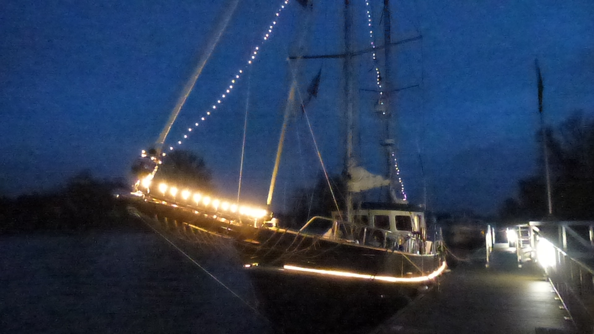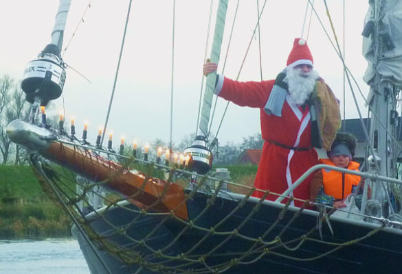 Weihnachtsmarkt in Oberndorf. Pünktlich um 14.45 Uhr erreicht die festlich beleuchtete Heimkehr den Anleger vor der Kirche, wo sie schon sehnsüchtig erwartet wurde. An Bord zwei wichtige Gäste: Der Weihnachtsmann mit seinem Rentier. Zur Freude aller Kinder hatte er einen prallgefüllten Sack mit vielen Leckereien dabei.
