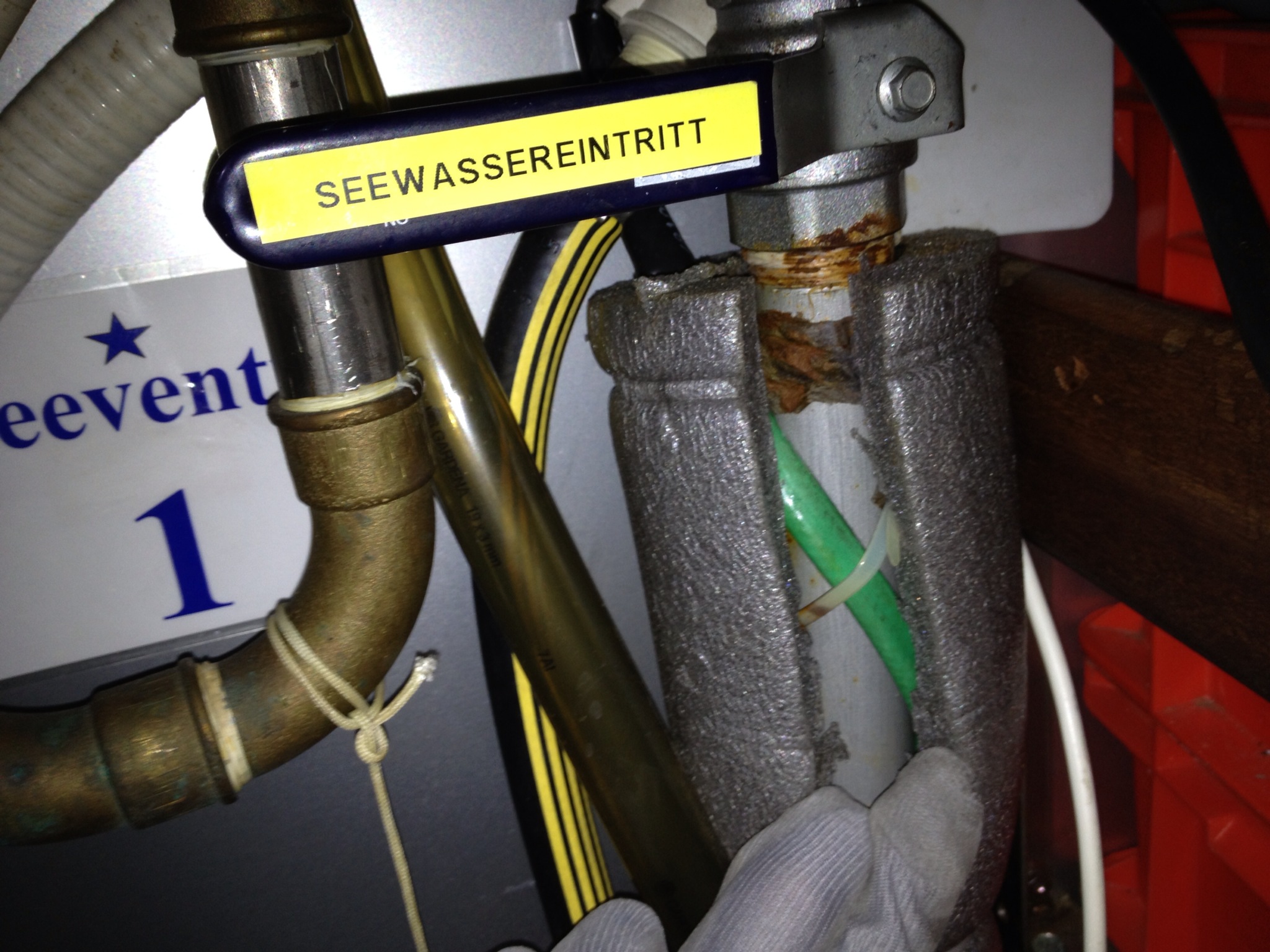 Frostschutz. Begleitheizungen nennt man die grünen Heizkabel, die wir an unseren Wassereintrittsrohren entlanglegen. Sie verbrauchen nur etwa 10 Watt pro laufendem Meter und heizen das Kabel auf ca. 15 Grad auf. Warm genug, um Frost zu verhindern. Wr haben sie flach auf dem Rohr entlanggelegt, mit Kabelstrapsen fixiert und dann mit Isoliermaterial eingepackt. Wir glauben, dass es für Schiffe, die im Winter im Wasser bleiben, sehr gefährlich ist, wenn die Eintrittsleitungen vom Schiffsinneren her zufrieren. Die Begleitheizungen gibt s in allen Längen im Internet. All’s warm im Maschinenraum. Marlene