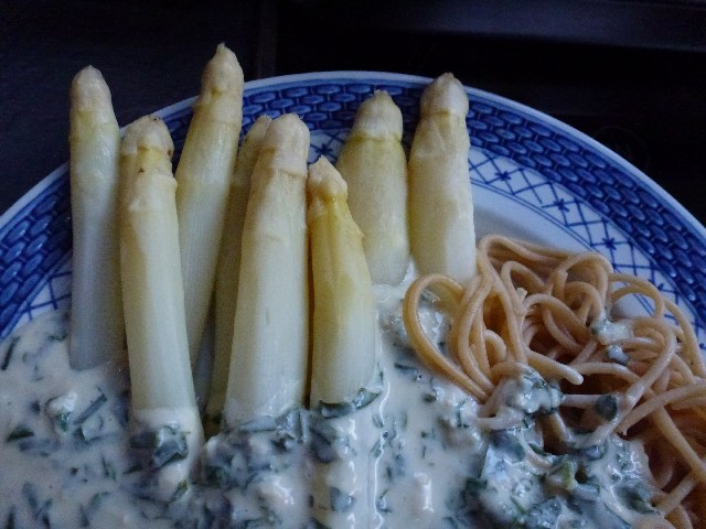 Oberndorf. Als wir zweieinhalb Jahre unterwegs waren, haben wir schwer gelitten. Nirgends gab es Spargel, höchstens mal grünen. Deshalb essen wir ihn jetzt fast jeden Tag. Unser aktueller Hit: Spargel mit Nudeln und Bärlauch-Gorgonzola-Soße. Gorgonzola schmelzen lassen, 7,5 prozentige Kondensmilch dazu (an Bord immer gut haltbar und nicht so fett wie Sahne) und dann tüchtig kleingeschnittenen Bärlauch dazu. Echt lecker und eine tolle Abwechslung zum klassischen Spargel mit Schinken und Butter. Sea U Bert