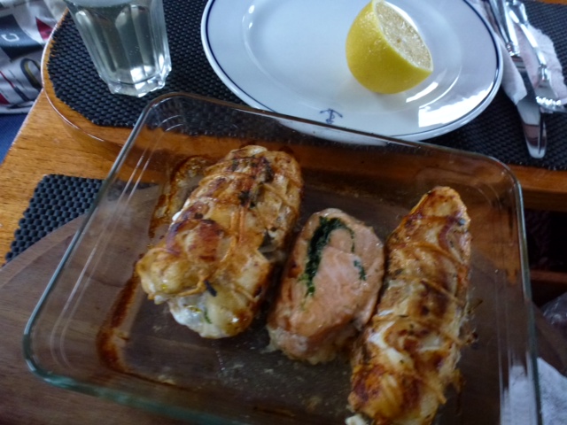 Lysefjord vor Anker. In Stavanger gibt es einen tollen Fischladen am Hafen. Die beiden, leider etwas unscharf fotografierten Rouladen sind Dorsch, mit dem Speck vom Parmaschinken und frischem Thymian. Die kleine Rolle ist Lachs mit grober Petersilie und Parmesan aufgewickelt. Ich hab dann die Soße aus dem Fischsaft, Kochsahne (10%), Zitrone und Thymian gemacht. In Fjordwasser gekochte Kartoffeln dazu.