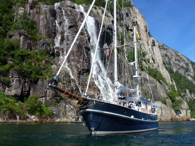 Lysefjord. Hier sind wir heute ganz dicht an einen der vielen Wasserfälle herangefahren. Dieser lag gleich neben dem Preikestolen. Diese berühmte Felswand geht 604 m senkrecht in die Tiefe, damit nicht genug, von der Wasseroberfläche geht es dann noch mal weitere 450 m in die Tiefe bis auf den Grund des Lysefjords. Durch so einen Fjord zu schippern und dazu Grieg hören, ist ein unvergessliches Erlebnis. Sea U Bert
