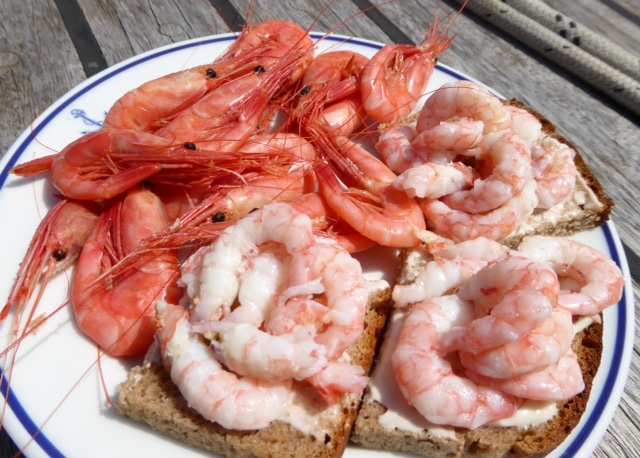 Unser bescheidenes Mittagessen Kirkehamn. Räker frisch vom Kutter, allerdings auch 20(!)€ das Kilo. Während Deutschland das billigste Land für Lebensmittel in Europa ist, sind wir hier in das Teuerste gesegelt. Sonst kühler Wind und keine Wolke, wunderschön. Sea U Bert Bert July 14, 2015