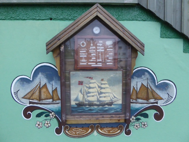 Akrehamn auf Karmoy. An vielen Häusern findet man hier teilweise sehr hübsche Schiffsbilder. Auch fast alle Briefkästen sind irgendwie bemalt.