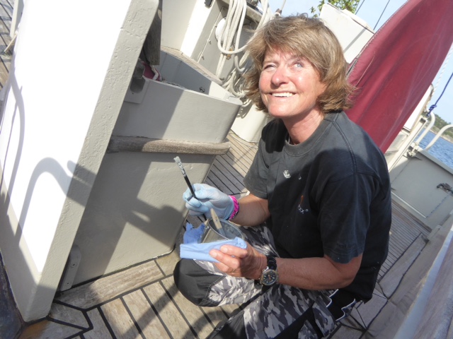 Dienst ist Dienst…… …..und zwischen durch wird gemalt. Nach der Frage, die wir im Ruderhaus hängen haben, was willst Du heute für Heimkehr tun, , versuchen wir jeden Tag etwas für s Schiff zu tun. Heute Rostschutzflecken und Ruderanlage abgeschmiert. Sea U Bert Bert August 6, 2015