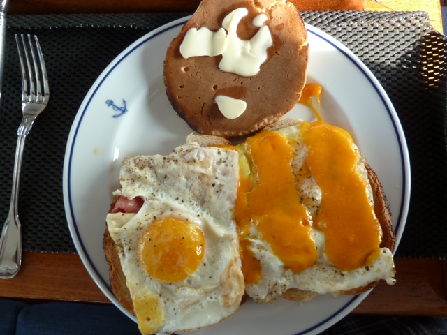 Hochseefrühstück, zwei Spiegeleier auf Toast, eines mit englischem Käsebelegt, dazu ein ameri kanischer Pancake mit Butter.