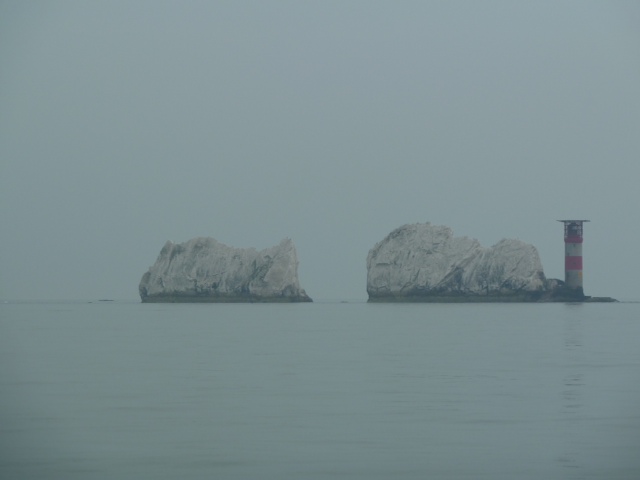 Das liegt auf der Isle of Wight. Schöner kleiner Hafen mit ganz niedlichem Dorf. Wir haben 20 Stunden gebraucht. Bei der Flaute war das bequem, nur lang. Nun Treffen wir Liz und Bill wieder und gehen dann nach Gosport, auch noch im Solent. Dort liegt die Victory von Lord Nelson, und die würd ich gern mal sehen. Das Bild zeigt den berühmten Leuchtturm Needles, am Westausgang des Solent, im Dunst. Sea u Bert
