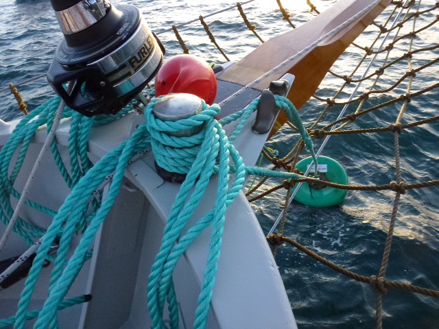 St. Mary’s Pool. Das Festmachen an der Mooringboje war sehr abenteuerlich. Die Leinen werden nicht direkt am Schäkel, sondern an einer einen Meter langen Kette festgemacht, die auf der Mooring befestigt ist. Wer soll denn da rankommen? Und das Ganze bei Schwell! Also Beiboot aussetzen, der Skipper dirigiert vom Bug aus und zerrt Leinen und Kette, die Crew kämpft mit Schlauchboot, Mooring, rostiger Kette, Leinen und Seegang. Geschafft, Heimkehr ist sicher angebunden. Nach dem ersten Gingerbier gibt’s schnelle Pfannkuchen mit Käse und zum Nachtisch einen Süßen mit Blaubeeren und Apfelmus. All’s fix und fertig an board – die Crew