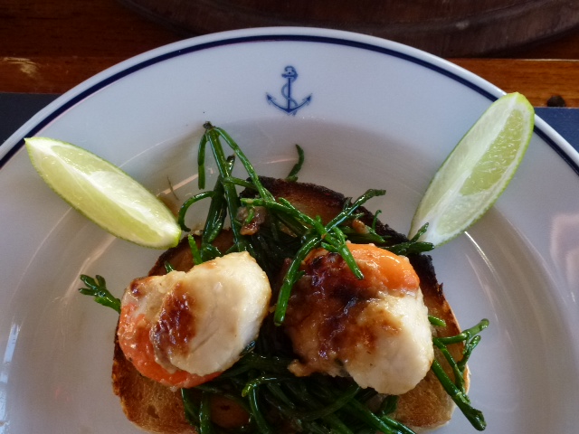 Falmouth. Ja die leckeren Dinger gibt’s hier überall. Aber auch nicht billig. Eine kostet so etwa ein englisches Pfund. Ganz sachte in Olivenöl gebacken. Mit etwas Ingwer und Zitronengras. Dazu Toast (21mm dick) und Samphire, eine hiesige Algenart. Die hab ich ganz zum Schluss in die Pfanne gegeben. Hinterher Wassermelonensaft, der neue Sommerdrink in unserer Oberndorfer Lieblingskneipe Kombüse 53 Nord. Wassermelone schälen und in den Mixer.Punkt. Sehr erfrischend, wie ja schon der Name sagt. Sea U Bert