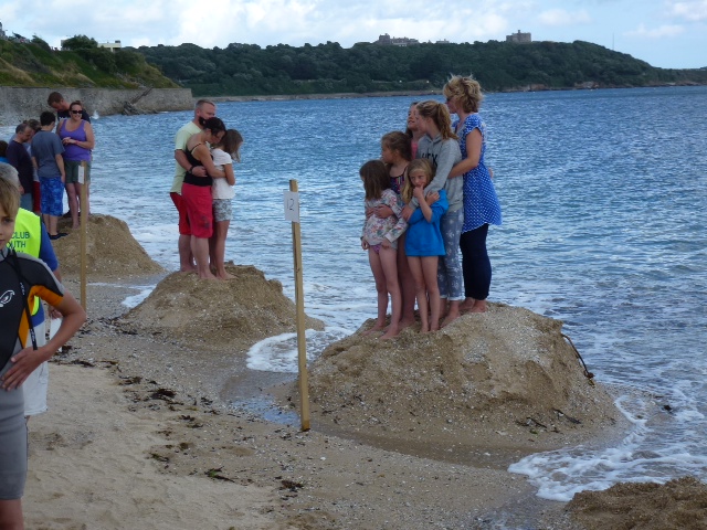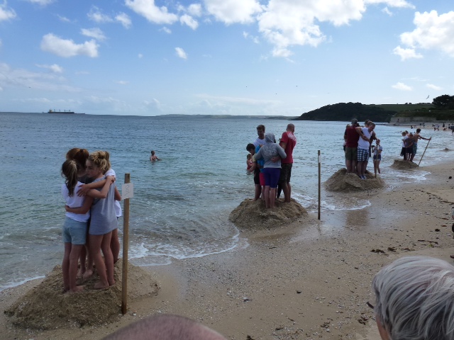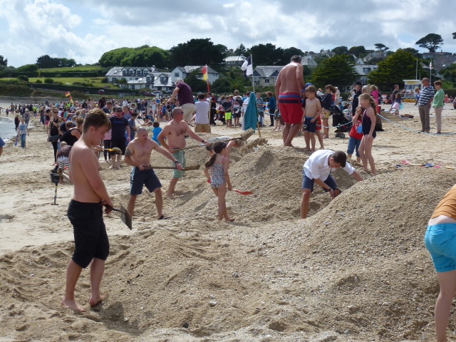 Falmouth. Frei nach Asterix scheint das hier so. Also: Die Jury steckt ein Gebiet am Strand ab. Hinter dieser Linie beginnen um Punkt halb drei hundert Leute, junge und alte, wie wild zu schaufeln. Am Ende stellen sie sich, je mehr, je besser, oben auf den Berg und warten, bis das Hochwasser ihnen den Sand unter den Füßen wegspült. Die am längsten auf ihrem Berg stehen, haben gewonnen. Ein riesen Spaß. Das Spiel heißt Tide Race. Limie ist übrigens eine freundliche Bezeichnung der Engländer bei den Marinen der Welt. Die stammt aus der Zeit, als gegen Skorbut auf den englischen Schiffen täglich Zitronensaft verabreicht wurde. Die Schiffe wurden daher LemonJuicer genannt. Sea U Bert