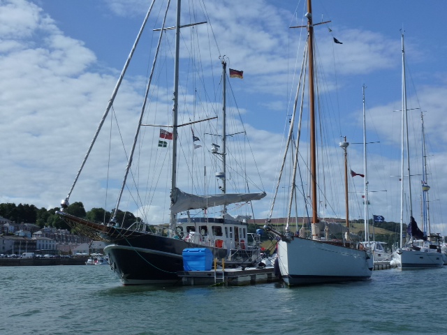 Dartmouth. Tolle Sache. Die Pontons liegen im Fluss vor Anker und bieten Platz für 6 – 8 Yachten. Keine Brücke zum Land. Entweder Dinghi oder Taxiboot für 2£ pro Nase. Gibt s hier überall in England. Sea U Bert
