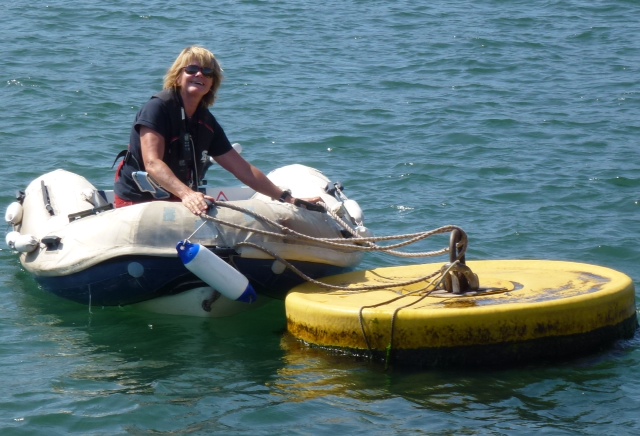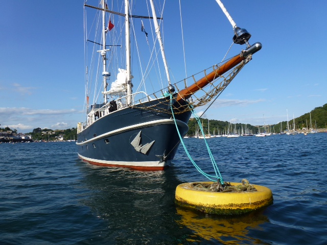 Fowey. Hier in Fowey liegt man an Moorings, Ankerbojen. Vier sind auch für Dicke wie Heimkehr zu gebrauchen. Das Festmachen geht am besten mit dem Beiboot. Also Fastmoker Leni ausgesetzt. Und Heimkehr angenäht. Sea U Bert