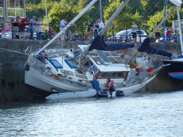 Dartmouth. Es ist hier üblich Schiffe sich gegen die Kaje legen zu lassen um deen Schiffsboden zu schrubben oder Reparaturen zu machen. Hier ging das schief. Kurz vor Niedrigwasser kippte die Yacht um. Dies kann erhebliche Schäden nach sich ziehen. Sea U Bert