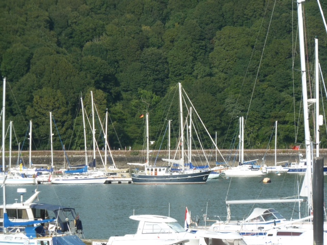 liegt Heimkehr, hier in Dartmouth. Wir sitzen auf der Bank gegenüber, wie sich das für Rentner so gehört. Hey, ihr jungen Leute, habt ihr das schon mal probiert? Einfach so sitzen und dem schiffigen Treiben zusehen? Ist cool. Wir sind hier nun angewachsen. Wollen Heimkehr hier lassen, wenn wir Dienstag nach Hause fliegen. Die Hafenmeister: we will keep an eye on her! Klingt gut. Außerdem kostet es hier die Hälfte, verglichen mit Plymouth. Auch gut. Es ist unglaublich schön, Zeit zu haben. Nun erstmal Touriprogramm. Sea U Bert