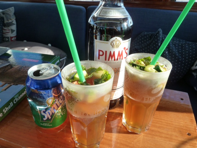 Torquay. Typisch englisch. Late afternoon drink. 1/3 Pimm’s, 2/3 Sprite, Minzeblätter, Limone, Gurke, und was sonst noch so da ist, zum Beispiel Äpfel, Erdbeeren oder Orangen. Super lecker … finden Marlene und Bert.