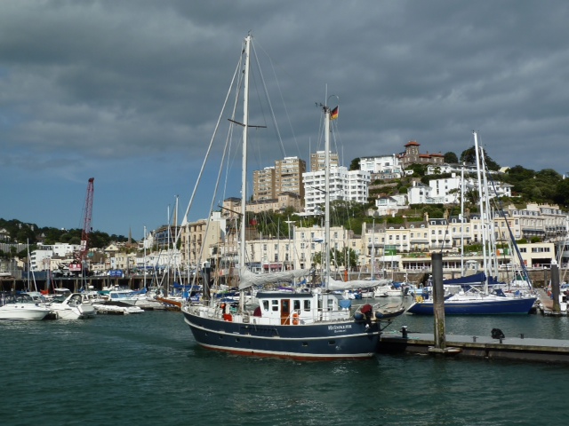 In See, auf dem Weg nach Torquay. Und wir dachten schon, die Fahrt durch das Race (Stromschnellen) an der Südspitze von Portland sei das Aufregendste am heutigen Tage. Aber in der Lyme Bay änderte sich das Wetter recht schnell, statt Sonnenschein jetzt dicke Wolken und ein starker Wind mit lang anhaltenden Böen bis sieben Beaufort. Großsegel gerefft, Klüver verkleinert und die Maschine an. So konnten wir mit Mühe den Kurs nach Torquay halten. Da hat sich das Wetter überhaupt nicht an die Vorhersage gehalten. Aber sonst: All’s we’ll on board – Marlene