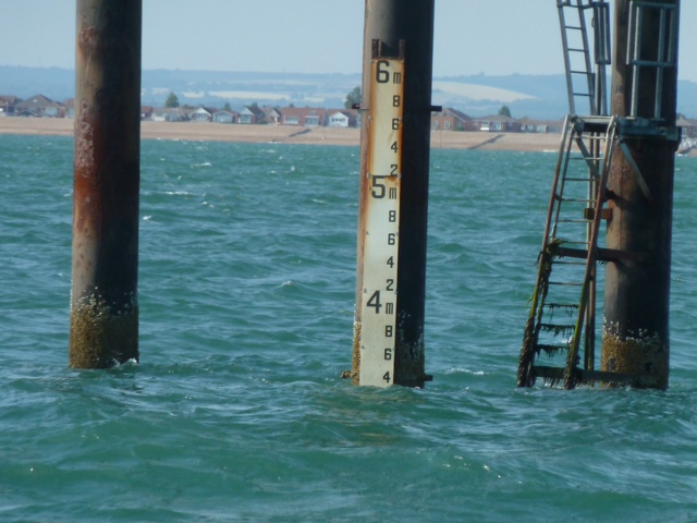 Vor Anker. Ein Pegel in der Einfahrt zeigt den Wasserstand über der Barre. Wenn die passiert ist kommt der Strom mit 4 Knoten entgegen. Aber es lohnt sich. Sea U Bert
