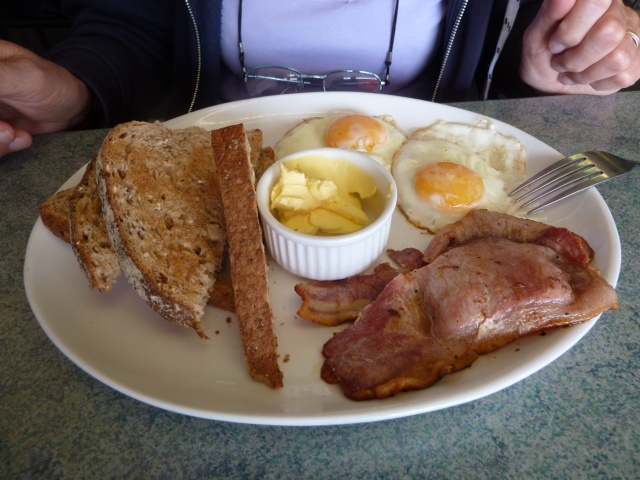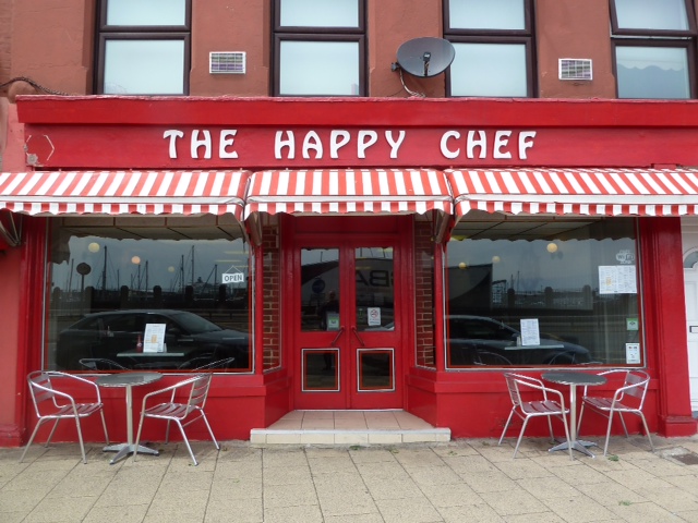 Dover. Hier in Dover unser Favorit. Hier gibt es den ganzen Tag Frühstück. Ganz lecker Ham and Eggs. Auf diesen Laden wird schon im Seehandbuch hingewiesen. Und der Name ist auch cool. Happy Bert