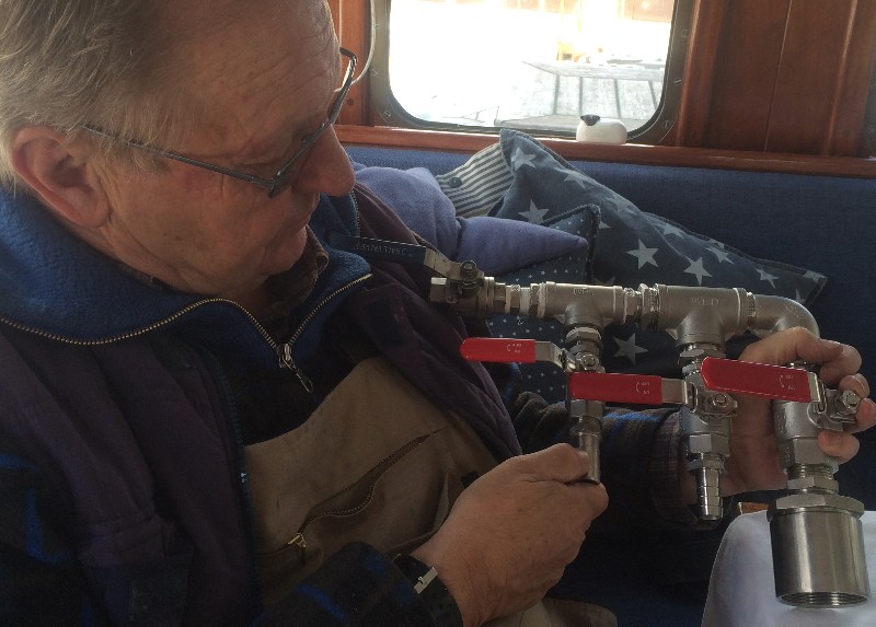 Glückstadt. Die neue Kühlwasser Leitung im Bb Maschinenraum. Von Michael Herrmann (Palstek) haben wir das rechte Ventil gelernt. Senkrecht oben drauf, können wir nun den Wasserschlauch anschließen zum Durchpusten oder einen Draht hineinstecken. Sea U Bert