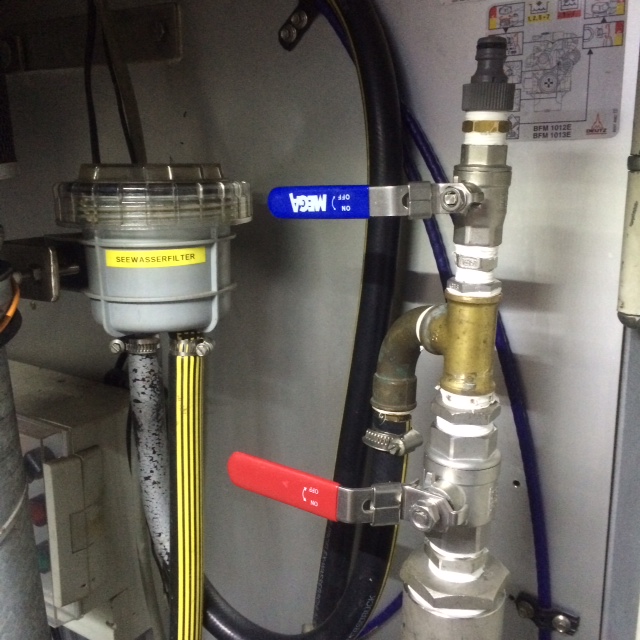 Rechts Bier, in der Mitte Rotwein, links Weisswein? Tatsächlich ist dies die neue Verteilung des Seewassers für die Maschine und das Bordnetz.