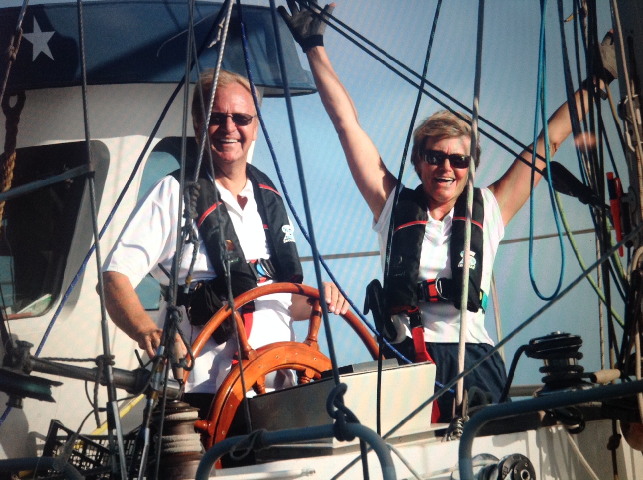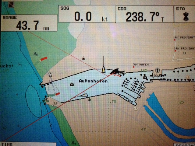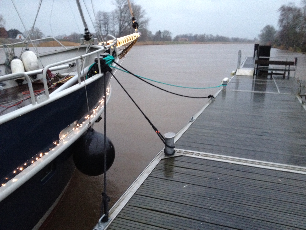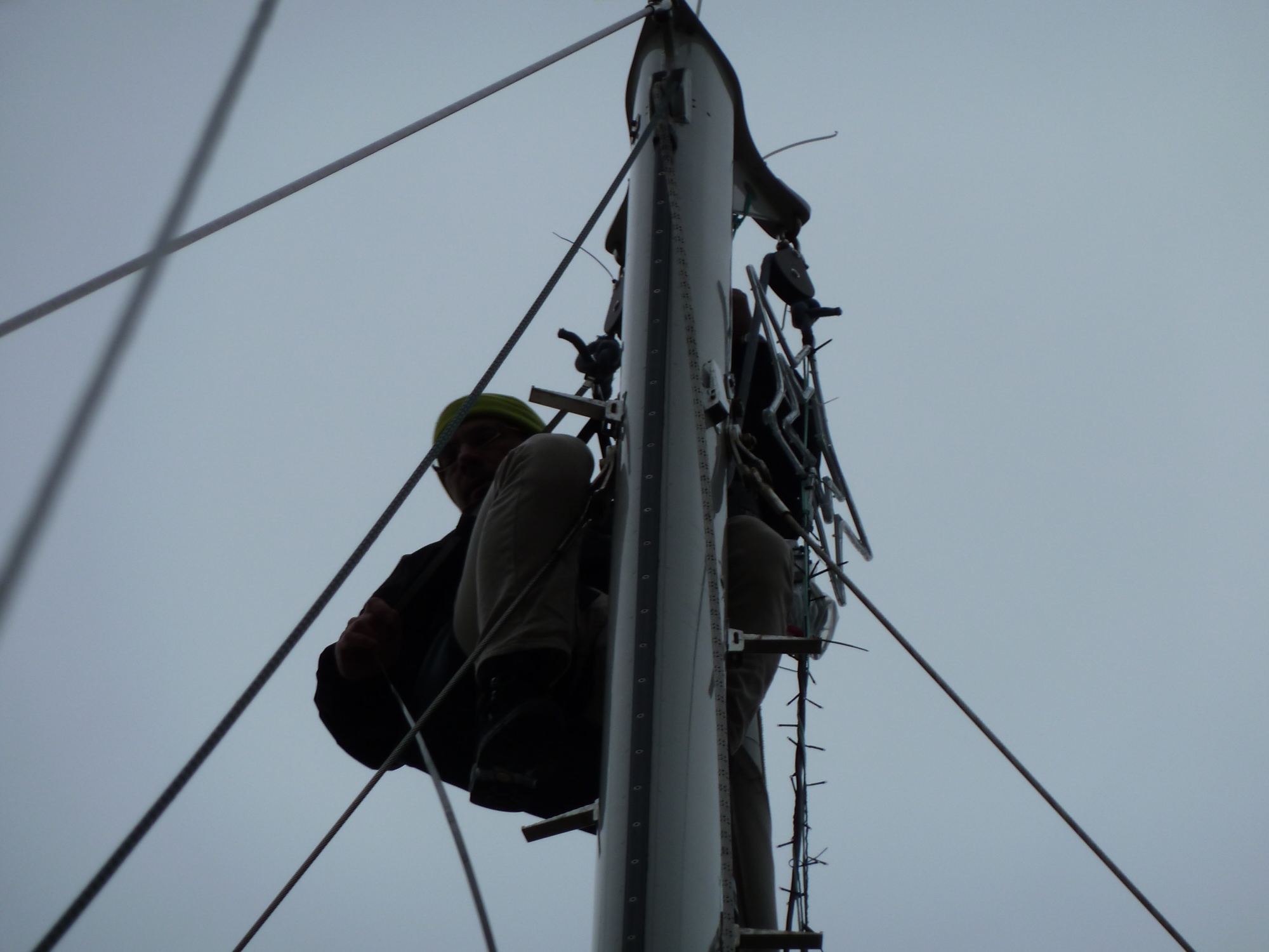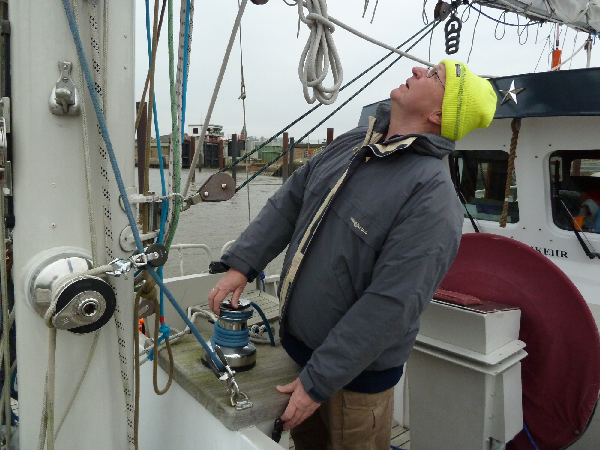 Nach der Ramming in Helgoland wird das Rigg überprüft. Norbert ist im Gehölz und prüft alle Drähte auf Herz und Nieren. Wir werden Vor- und Achterstag sowie die Seitenstagen vom Klüverbaum austauschen, weil sich durch den Schwell im Helgoländer Hafen unser Havariegegner diverse Male auf unseren Klüver gesetzt hatte. Das hat die Drähte überdehnt. Sea U Bert