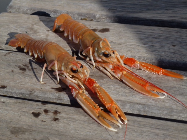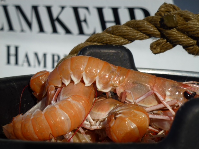 Nephrops Norvegicus, oder norwegischer Hummer oder Kaisergranat wird dieses leckere Getier genannt. Der gestern Abend ausgelaufene Kutter hat sie mitgebracht.. Gefischt werden sie nachts, denn sie verlassen ihre selbstgegrabenen Gänge in 40 bis 250m Tiefe nur nachts. So laufen die Kutter abends aus und morgens wieder ein. Immerhin 11 waren heute hier. In den Scheren ist so wenig Fleisch, dass sich die Puhlerei nicht lohnt. Gegessen werden die Schwänze. Sieben Minuten in Seewasser gekocht. Wir haben heute eine Knoblauchmayonaise dazu gemacht und im Restaurant nebenan gibt es ein prima Baguette. Die Jomfruhommer, so heißen sie in Dänisch, kosten hier nur 40 Kronen pro Kilo, das ist ein Bruchteil des Festlandpreises.
