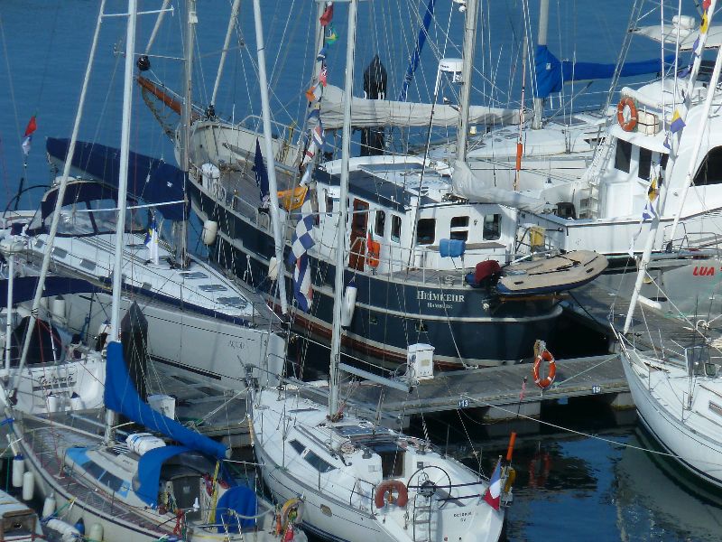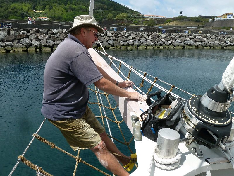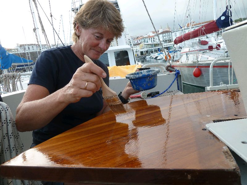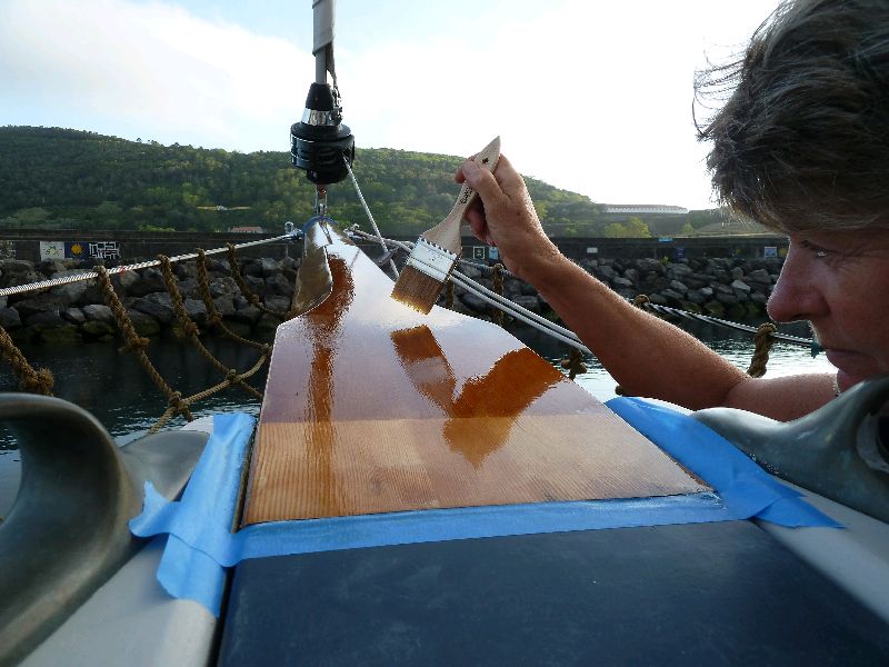 Angra, Terceira, Azoren. Heute Schleifen und Malen. Naturholz. Müssen wir in der südlichen Sonne mindestens alle halbe Jahr machen. Außerdem kommt Mutz morgen, und da muss alles fein im Lack sein, das ist sie von der ‘Glauke’ so gewöhnt. Sea u Bert