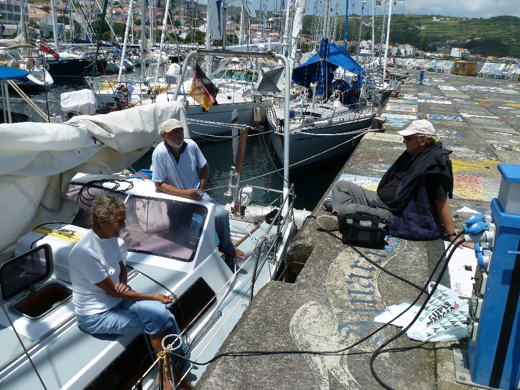 Horta, Faial, Azoren. Es wehte mit 6 und manchmal mit 7 Windstärken. Wenn’s so weht, gehen wir nicht von Bord. Wir haben einen Film gesehen. Gegen Mitternacht hören wir den Notruf einer der deutschen Yacht BLUE, die bei auflandigem Wind kurz vor dem Hafen Maschinenausfall meldet und sofortige Hilfe braucht. Der Seegang vor dem Hafen ist erheblich. Die Hafenmeisterei verspricht binnen 10 Minuten einen kleinen Schlepper zu schicken. Marlene sucht die Einfahrt mit dem Fernglas ab, es ist stockfinstere Nacht und es regnet. Sie entdeckt eine unbeleuchtete Yacht etwa 100 m vor vor den Felsen treibend. Es ist ANNIE, die kennen wir, hat sich von der Mooring losgerissen, niemand an Bord. Wir machen das Beiboot klar, auftanken, ziehen uns Schwimmwesten an, Funkgeräte und Notausrüstung. Bert versucht über Funk die Crew der BLUE draußen zu beruhigen, deren Treibgeschwindigkeit ist nach unserem AIS nur 1,2 kn. Wir sausen zum Schlepper, in die schwarze Nacht. Dort angekommen machen wir dem Hafenmeister klar, dass dies ein weiterer Notfall ist und nicht die Yacht, die um Unterstützung gebeten hat. Wir teilen BLUE mit, dass es parallel einen weiteren Notfall gibt und bitten um Geduld. Leni besetzt die treibende ANNIE und Bert beginnt sie mit unserem Schlauchboot in den Hafen zu schieben. Großes Geschrei am Bug, der Schlepper hat die Leinen von ANNIE in der Schraube und geht notmäßig vor Anker. Damit haben wir Notfall Nummer drei. Leni löst die Verbindung zum Schlepper und macht im Stockdunkeln das festgesetzte Ruder von ANNIE klar und meldet, dass sie sich steuern lässt. Wir schieben ANNIE langsam von den Felsen weg. Kurz bevor wir HEIMKEHR erreichen, geht ein Squall mit gut 8 Windstärken durch den Hafen, ANNIE schiebt 25 Grad Lage vor Top und Takel. Ein Wolkenbruch nimmt uns jede Sicht, wir sind durch und durch klitschnass. Der Schlepper meldet, dass er die Tampen aus der Schraube hat, geht ankerauf und nimmt BLUE auf den Haken. Wir bringen ANNIE bei der vor Anker liegenden HEIMKEHR längsseit und schaffen es, eine Leine rüberzubringen. Damit ist ANNIE erstmal gerettet. Die Nachbarn auf dem irischen Kutter kommen zu Hilfe. BLUE meldet eine seiner beiden Maschinen wieder klar. Grund des Ausfalls: auch einen Tampen in der Schraube. Wir können sie gemeinsam sicher an die Pier bringen, die Crew ist glücklich. Danach bringen wir zusammen mit dem Schlepper und der Besatzung des irischen Kutters ANNIE an die Pier. Leni fährt das schwierige Manöver auf ANNIE. 5 Minuten später ist plötzlich der Wind weg. Als wenn nichts gewesen wäre. Um halb drei sind wir in der Koje. Sonst war nichts besonderes los gestern. _____/)_______ Ach so, vorgestern hatten wir eine schwedische Yacht aus Marstrand eingeschleppt, Maschinenschaden. Und gestern eine englische Yacht, die einen Tampen in der Schraube hatte. Man kommt hier nicht aus der Übung. Aufgrund der besonderen Umstände leider keine Fotos! Sea u Marlene und Bert