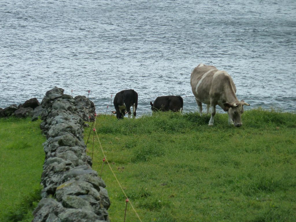 Flores, Azoren. Hier gbt es prima Käse. Ein Segen nach dem immer gleich schmeckenden US Käse. Die Lieferanten sind die Kühe. Es gibt Braunkühe, Weißkühe, Schwarzkühe, Graukühe und Holsteiner. Muuuuhh Bert