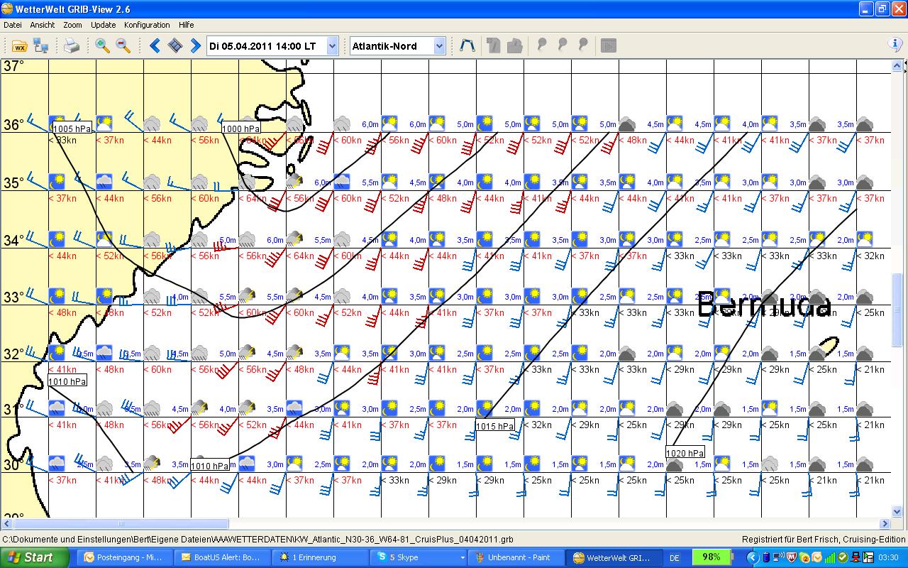 Charleston. Heute pfeifft’s hier. Anbei ein sogenanntes Grib-File. So bekommen wir jeden Tag das Wetter für 5 Tage aus Kiel. Leider schicken die aus Kiel auch nicht nur gutes Wetter. Dieses Beispiel zeigt für heute Böen bis 64 Knoten, das ist Windstärke 12. Mit so etwas wollen wir nichts zu tun haben. Nach diesem Sturm scheint es ruhiger zu werden. Wir sind mit den Wetterfröschen einig, dass mit Auslauftermin Mittwochabend oder Donnerstagmorgen die Chance besteht, ein ruhigeres Wetterfenster für die 800 Seemeilen weite Reise nach Bermuda zu erwischen. Das Tief, das dem heutigen folgt, ist schwächer. Also drückt uns die Daumen. Letze Arbeiten sind in Gang, aber eigentlich ist Heimkehr klar zum Auslaufen. Richtung Oberndorf. Sea U Bert