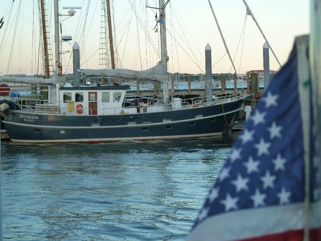 Charleston. Die Heimkehr liegt schon an der Fuel Pier. Sie liegt tief im Wasser, denn 472 Gallons Diesel (entsprechend 1680 Liter) haben wir in unsere Tanks gepumpt. Dazu noch eine Tonne Frischwasser und Wasser in Kanistern für den Notfall. 95 Liter Benzin für Außenborder und Generator werden in Kanistern an Deck gelascht. Alles wird festgezurrt, denn wir nehmen den Atlantik natürlich sehr ernst. Der Abschied von unserer kleinen Hafenwelt fällt schwer, wie die Abschiede so sind. Aber hinterm Horizont gehts weiter, da liegt Oberndorf. Sea u Bert