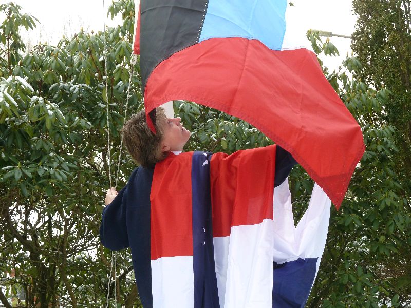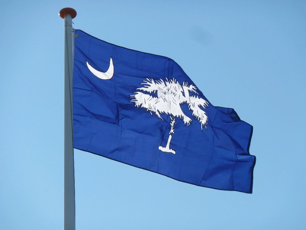 Oberndorf, Osteland. Eine schöne Flagge, die von South Carolina. Der Mond über der Palme, genaugenommen ein Palmetto. Da liegt unsere Heimkehr, die ‘Dicke’. Und wartet darauf wieder in Schwung gebracht zu werden. Am Dienstag fliegen wir hin, heute waren 23 Grad dort. Sea u Bert