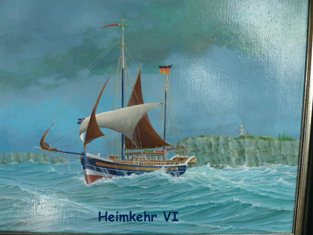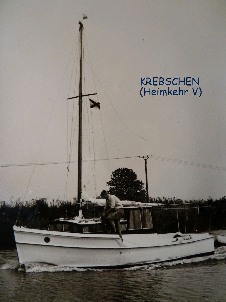 Oberndorf, Osteland. Warum eigentlich HEIMKEHR VII? Heimkehr, ein traditioneller Fischkuttername an der Küste, ist auch Tradition in unserer Familie. Die erste Heimkehr meines Großvaters war eine schmucke Yawl ohne Hilfsmotor, aber mit einem motorisierten Beiboot, Schleppfuchs, das auf der ersten Reise in See verlorenging. Die II war eine zum Raddampfer umgebaute Schute, eher ein Hausboot, für die Berliner Seen. Die Heimkehr III war mit 34 m die bei weitem größte Heimkehr, ein Binnenschiff mit zwei Jastrammotoren, die vom Bootsmann umgesteuert werden mussten. Haupteinsatzgebiet auch die Berliner Seen, denn hier lebte mein Großvater. Sie wurde von den Russen beschlagnahmt und sank später auf dem Dnjepr. Die IV war ein echter Fischkutter, weil es meinen Vater nach dem Krieg in die Fischerei verschlagen hatte. Während der Fischereiphase im Leben meines Vaters wurden zwei Fischutter neu aus Stahl gebaut, die Osterems und die Westerems. Beide haben von Borkum aus gefischt. Die Heimkehr V hieß unverständlicherweise ‘Krebschen’ und war ein umgebautes Marine V-Boot, das einem Maine Lobsterboat sehr ähnlich sah. Wir haben sie aber als ‘Heimkehr’ mitgezählt. Die VI ist der von uns über alles geliebte Holzkutter, von Bieritz in Friedrichskoog gefühlvoll umgebaut. Na und die HEIMKEHR VII kennt Ihr ja. Sea u Bert
